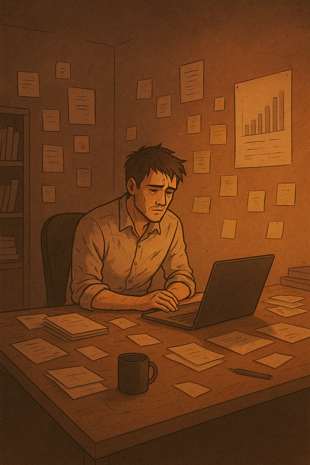Namun, kenyataannya, satu per satu tim mulai pergi. Ada yang menyerah karena tekanan, ada yang merasa lelah tanpa kepastian, ada juga yang memilih jalan lain demi masa depannya sendiri. Hingga akhirnya, yang tersisa hanyalah ia sendiri—seorang founder dengan ruangan kerja yang penuh catatan, tumpukan buku, dan laptop yang masih menyala di tengah malam.